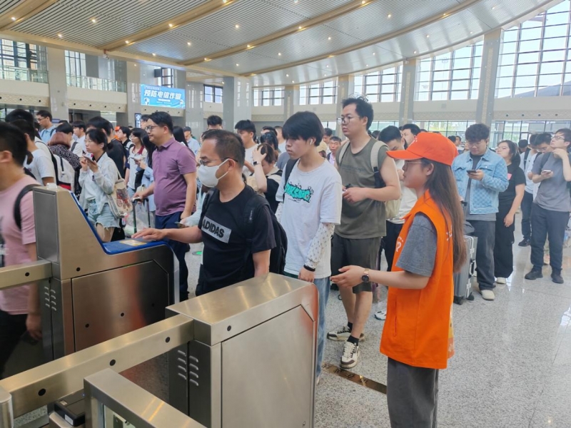 6月8日,完成志愿服务岗前培训的38位青年志愿者早早地到达指定位置,在各场站负责人的带领下,换上“小甜橙”志愿者马甲,奔走在往返的旅客之间。“阿姨您好,人工检票通道在进门右手边。”“您所乘坐的车次在第5候车室,您上电梯后右转,看到指示牌走过南北通道就是”,“请各位乘客在闸机前有序排队检票进站,不要挤”,“奶奶您要坐的G7004快要检票了,我现在带您过去吧?”
