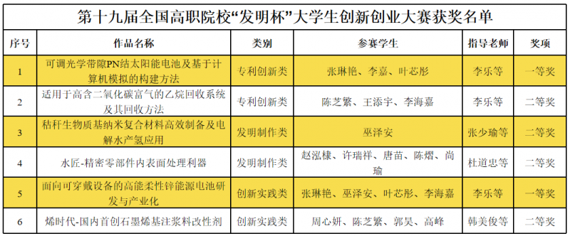 本届大赛由中国发明协会、山东省教育厅和山东省人力资源和社会保障厅共同主办,国家知识产权局专利局人事教育部指导,中国发明协会高等职业院校发明创新分会和山东理工职业学院承办。大赛以“知识产权推动创新,科学技术推进文明”为主题,吸引了来自全国153所高职院校的踊跃参与,共提交作品36165件,其中400件入围决赛。在本次大赛中,Beat365官网学子凭借扎实的专业功底和突出的创新能力,斩获佳绩。其中,Beat365唯一官方网站张琳艳等同学完成的《可调光学带隙PN结太阳能电池及基于计算机模拟的构建方法》和《面向可穿戴设备的高能柔性锌能源电池研发与产业化》荣获一等奖,《适用于高含二氧化碳富气的乙烷回收系统及其回收方法》等4件作品荣获二等奖。
