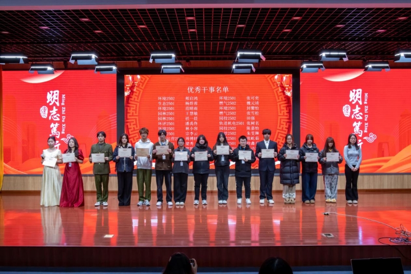 晚会节目形式多样、内容精彩纷呈,涵盖歌曲、舞蹈、小品、书法、乐器演奏等多个类别,尽显师生多才多艺与青春活力。开场器乐演奏《你要跳舞吗》以欢快节奏瞬间点燃全场;歌曲联唱《always online》藏着对未来的憧憬;小品《热带惊雷》凭借诙谐表演引得掌声雷动;书法《元旦墨韵》以铿锵笔锋抒发青年壮志;乐器演奏《山行》用悠扬旋律增添雅致氛围。精心设计的互动环节,让幸运观众接连诞生,将现场气氛一次次推向高潮。舞台上演员全情投入,舞台下观众热情高涨,闪光灯与欢呼声汇成欢乐海洋。随后,在激动人心的榜样人物表彰环节,老师们依次为获评“优秀班辅”“优秀干事”的同学颁发荣誉证书,台下响起阵阵热烈掌声。最后,近两个小时的晚会在大合唱《新时代之歌》的悠扬旋律中落下帷幕。